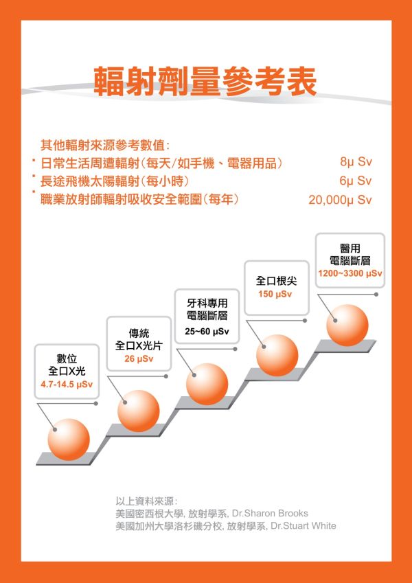 一般日常生活中的天然背景輻射包含手機、電器用品等,人體每天會吸收的輻射劑量就已經有8微西弗(µSv)。而拍攝牙科專用的電腦斷層人體僅僅只有吸收25~60微西弗(µSv),是目前市面上劑量最低的電腦斷層。